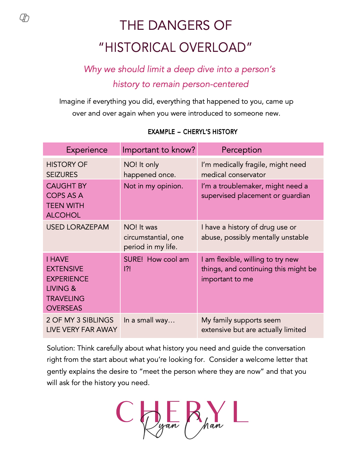 An important lesson in why we should limit a deep dive into a person’s history to remain person-centered: Imagine if everything you did, everything that happened to you, came up over and over again when you were introduced to someone new.